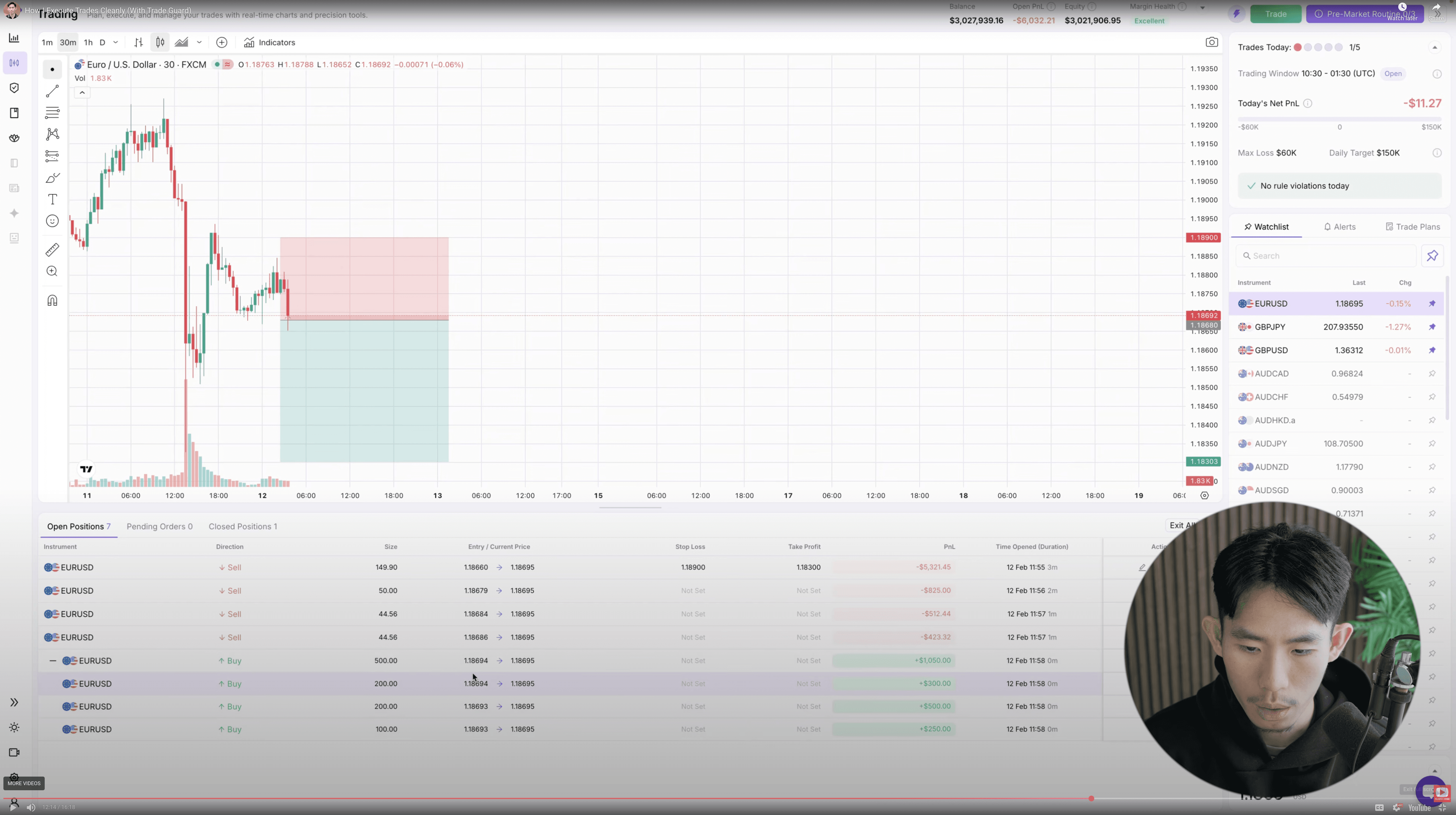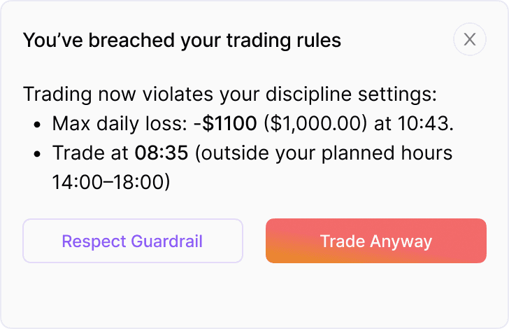Trade with your plan pinned beside the chart. Position size auto-calculates, and guardrails block the trades that break your rules.