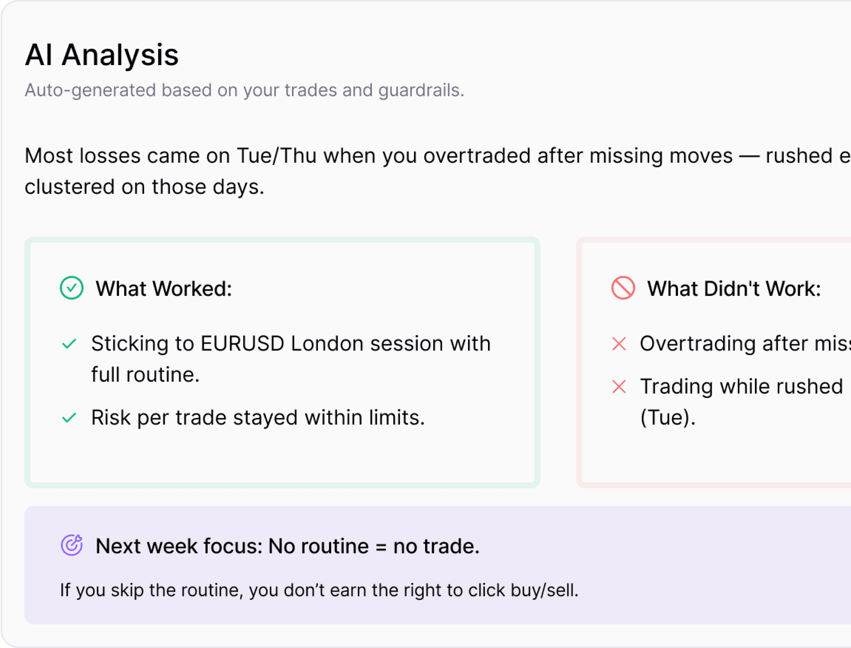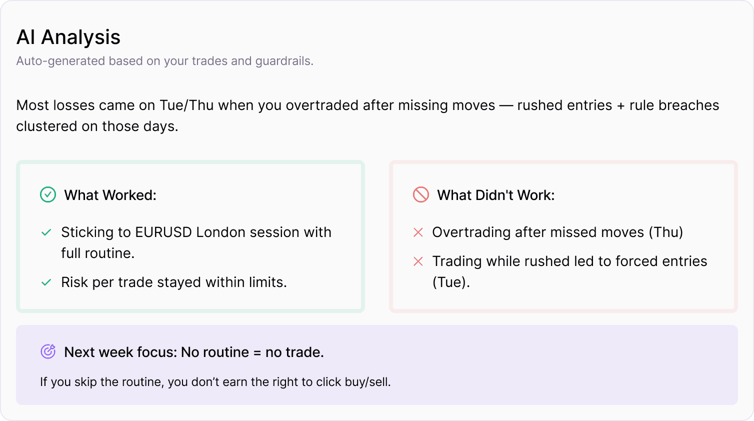 Get a clear weekly breakdown of what worked, what didn’t, and one focus for next week, based on your execution and journal data.