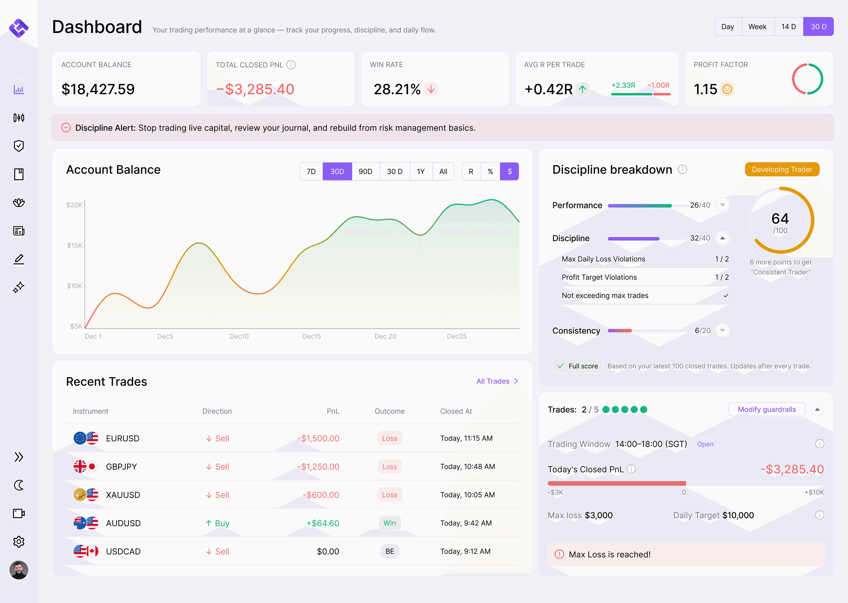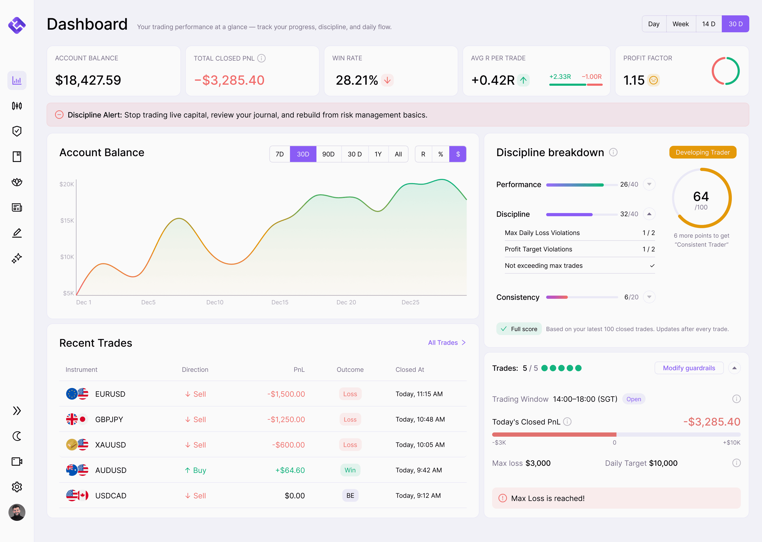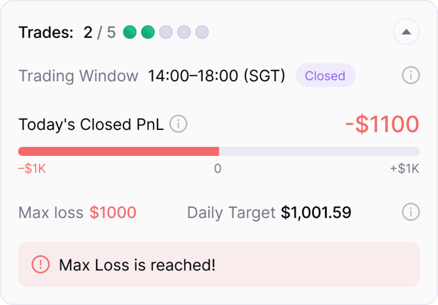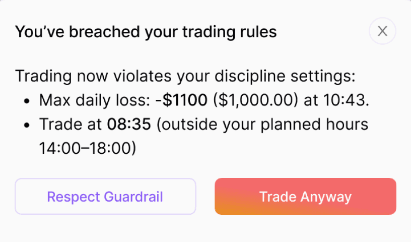 Set limits: max trades, max daily loss, profit cap, risk per trade, and session windows. Hit a limit and the Trade button disables. Override or respect the guardrail.