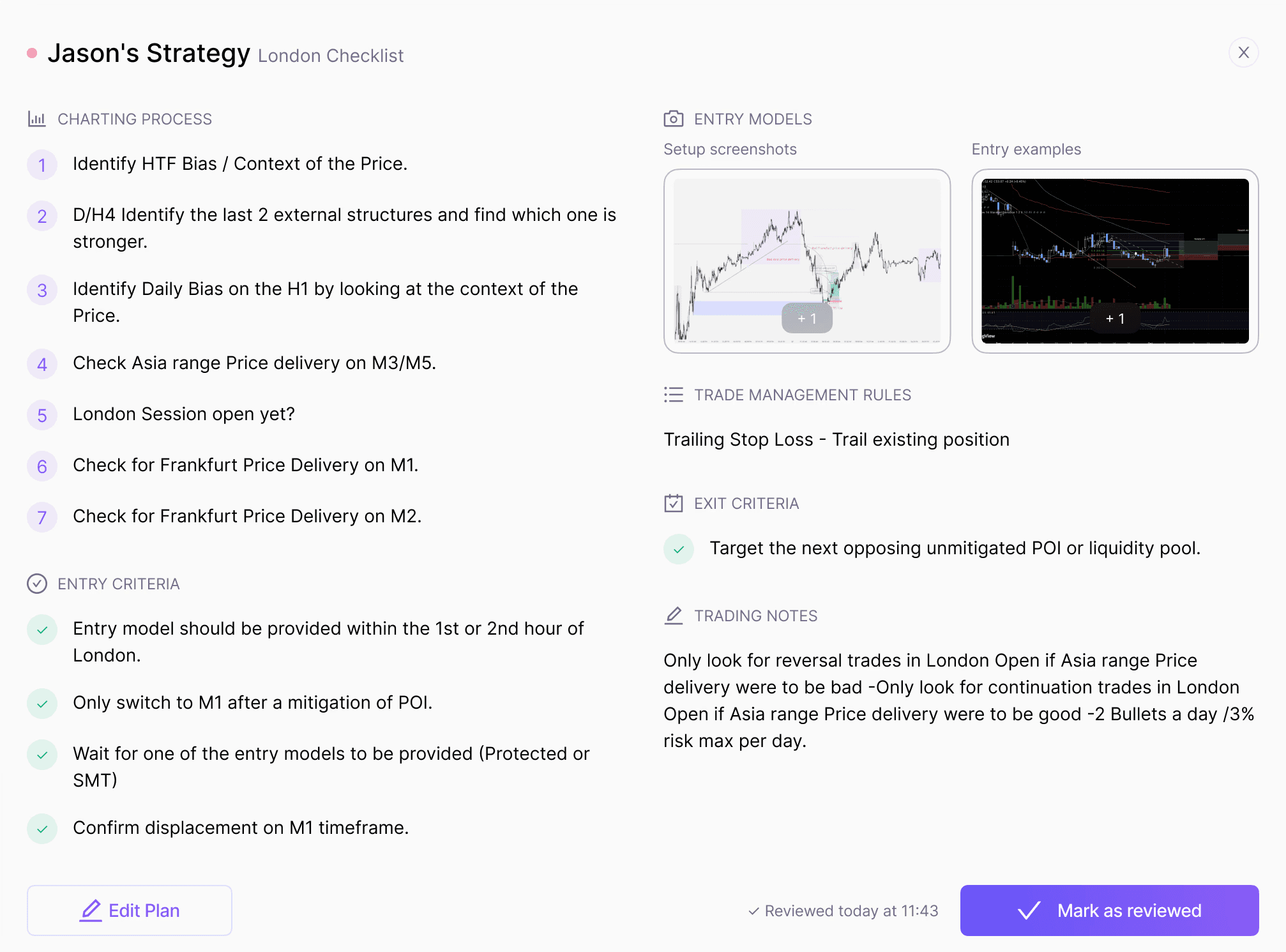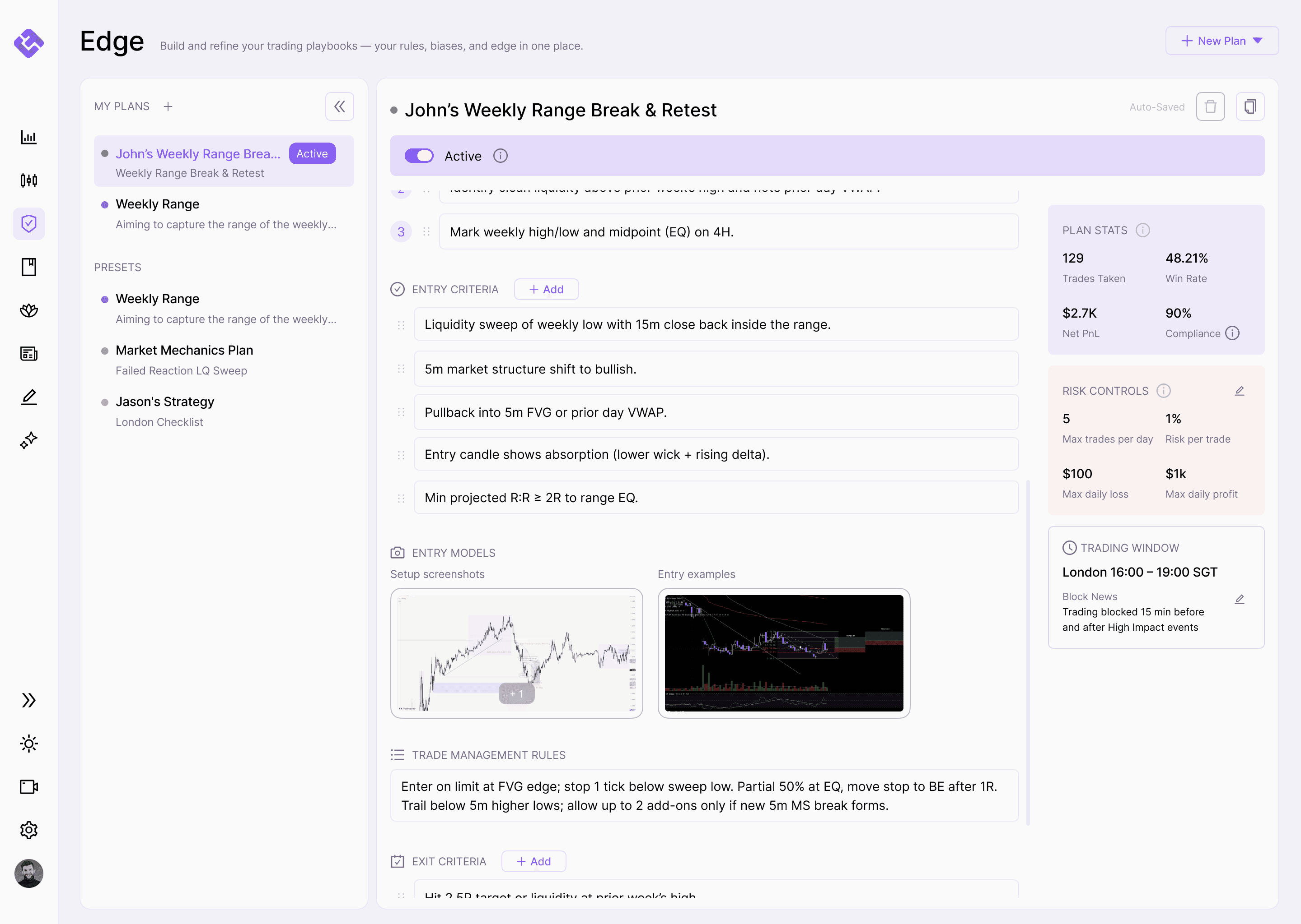 Define your setups, criteria, invalidation, and management rules inside Edge. Set one plan as Active, and keep it visible during execution so you stop improvising.