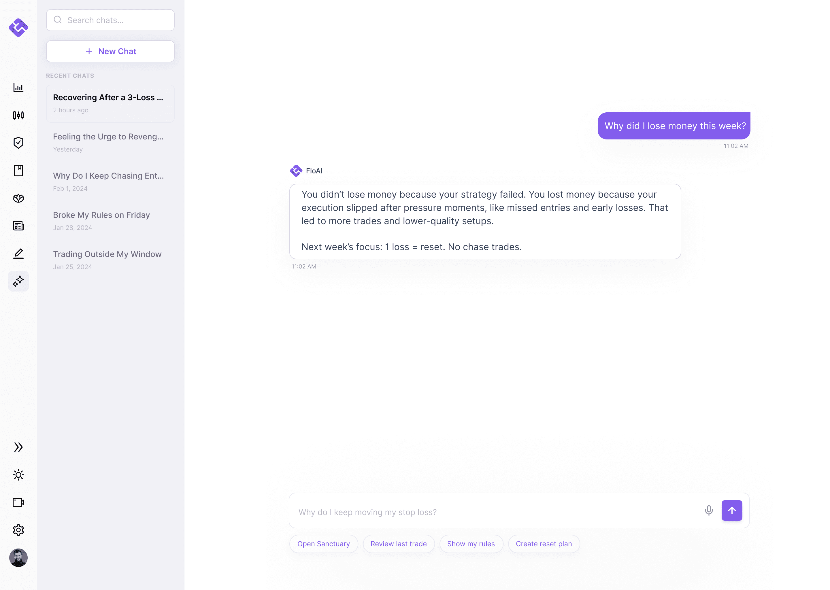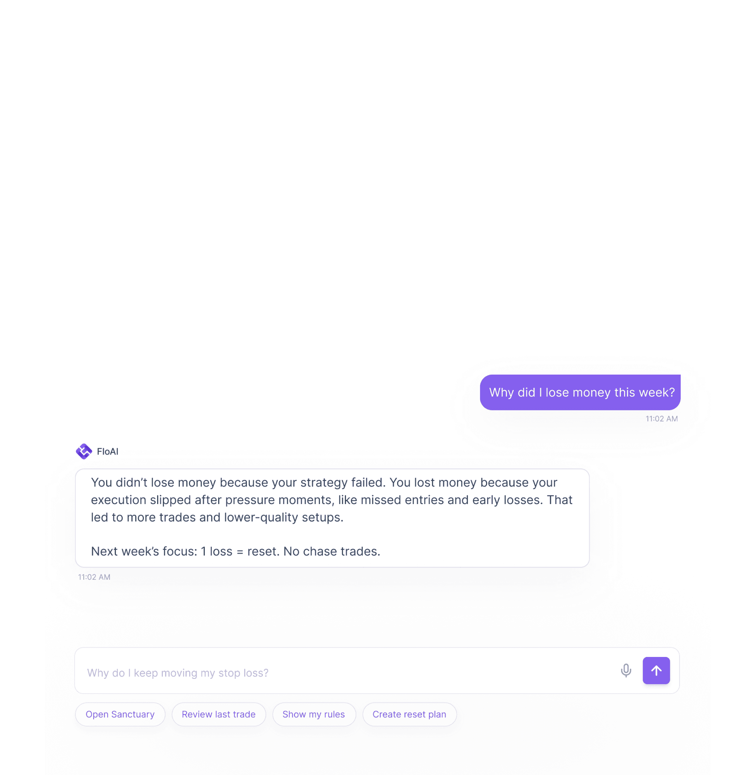 FloAI turns your execution and journal data into clear guidance. Ask questions, get instant feedback, and see what to focus on next.