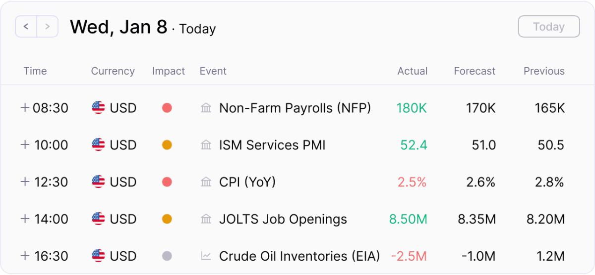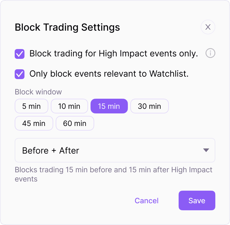 EdgeFlo surfaces high-impact events and lets you set no-trade windows around them. We'll block execution so you don't get slipped.