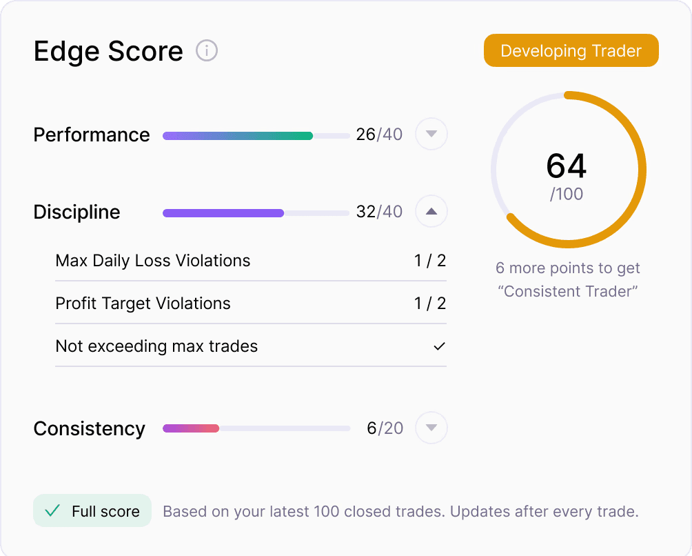 Win rate, profit factor, equity curve... and your Edge Score. The dashboard answers one question: "Am I trading well right now?"