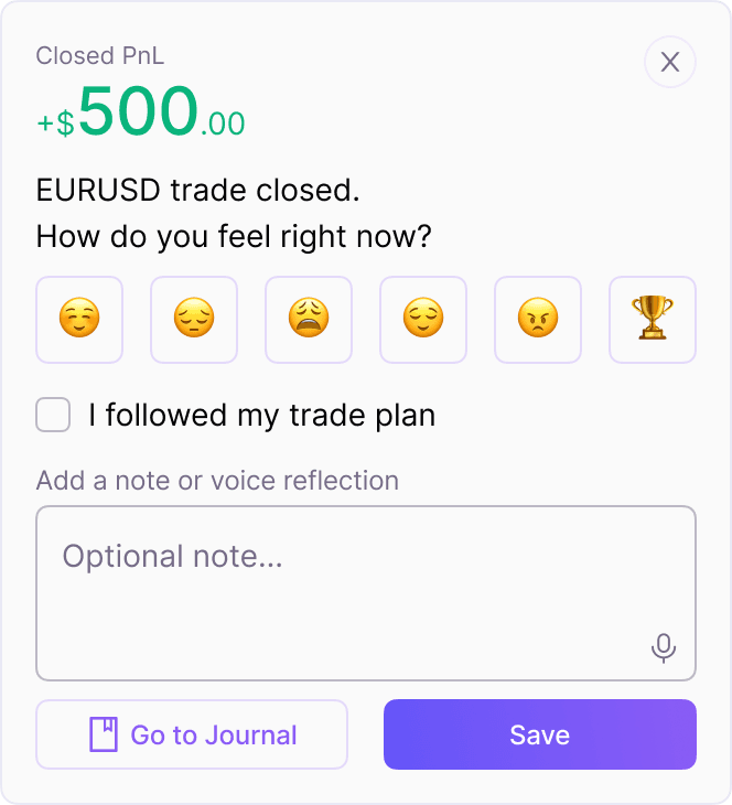 Trades auto-import instantly. Tag emotions while they’re fresh, add notes and screenshots, and get a weekly AI recap on what to fix next