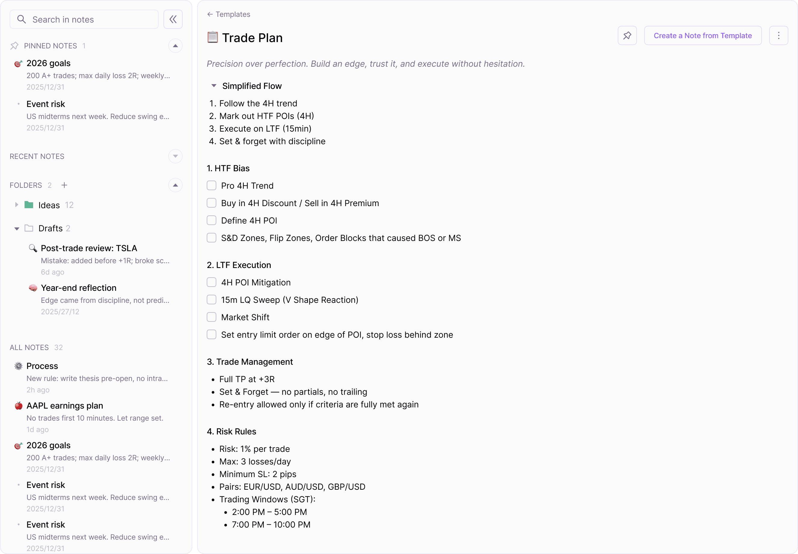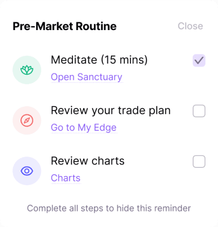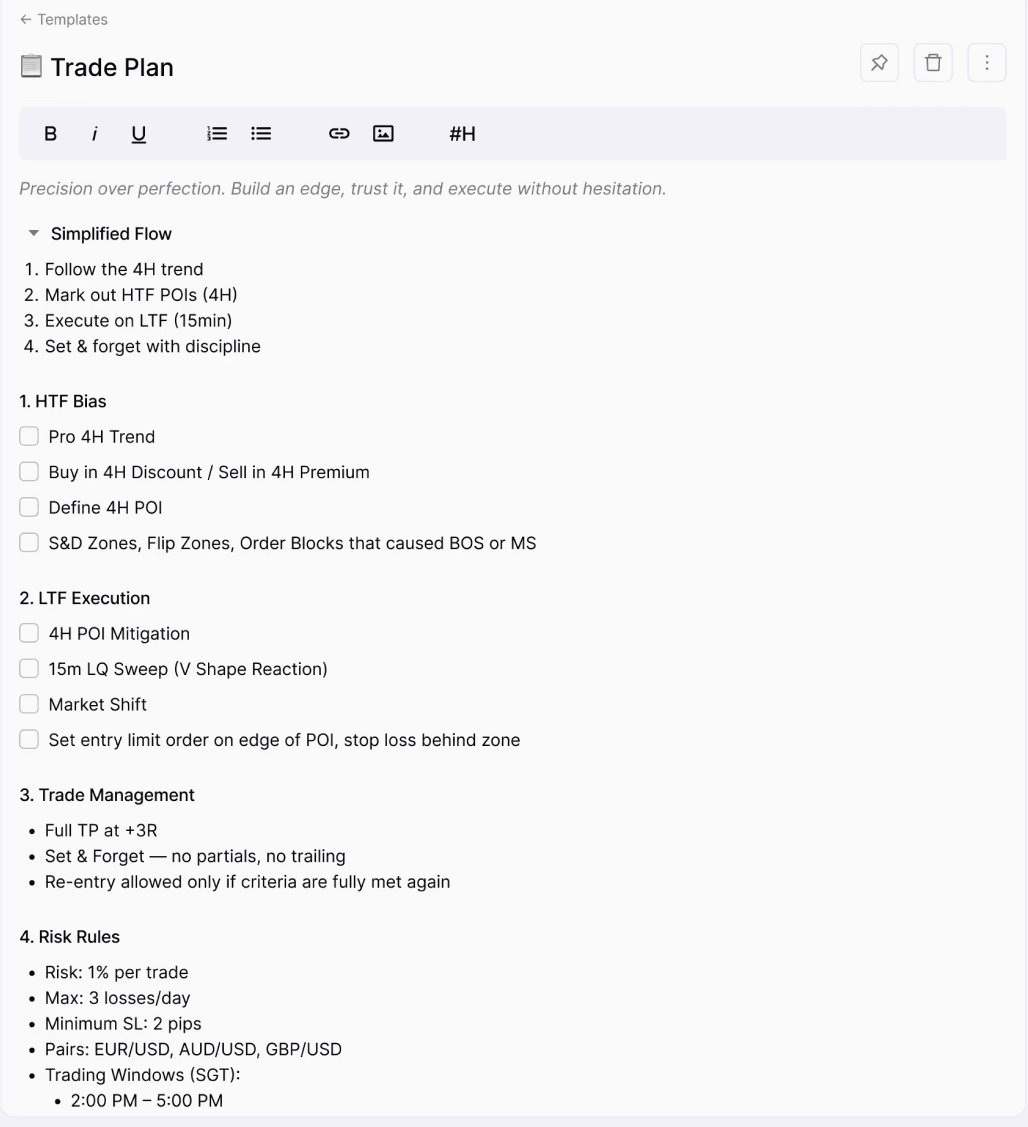 Start every session with a simple checklist that locks in your bias, plan, and risk limits before you trade.