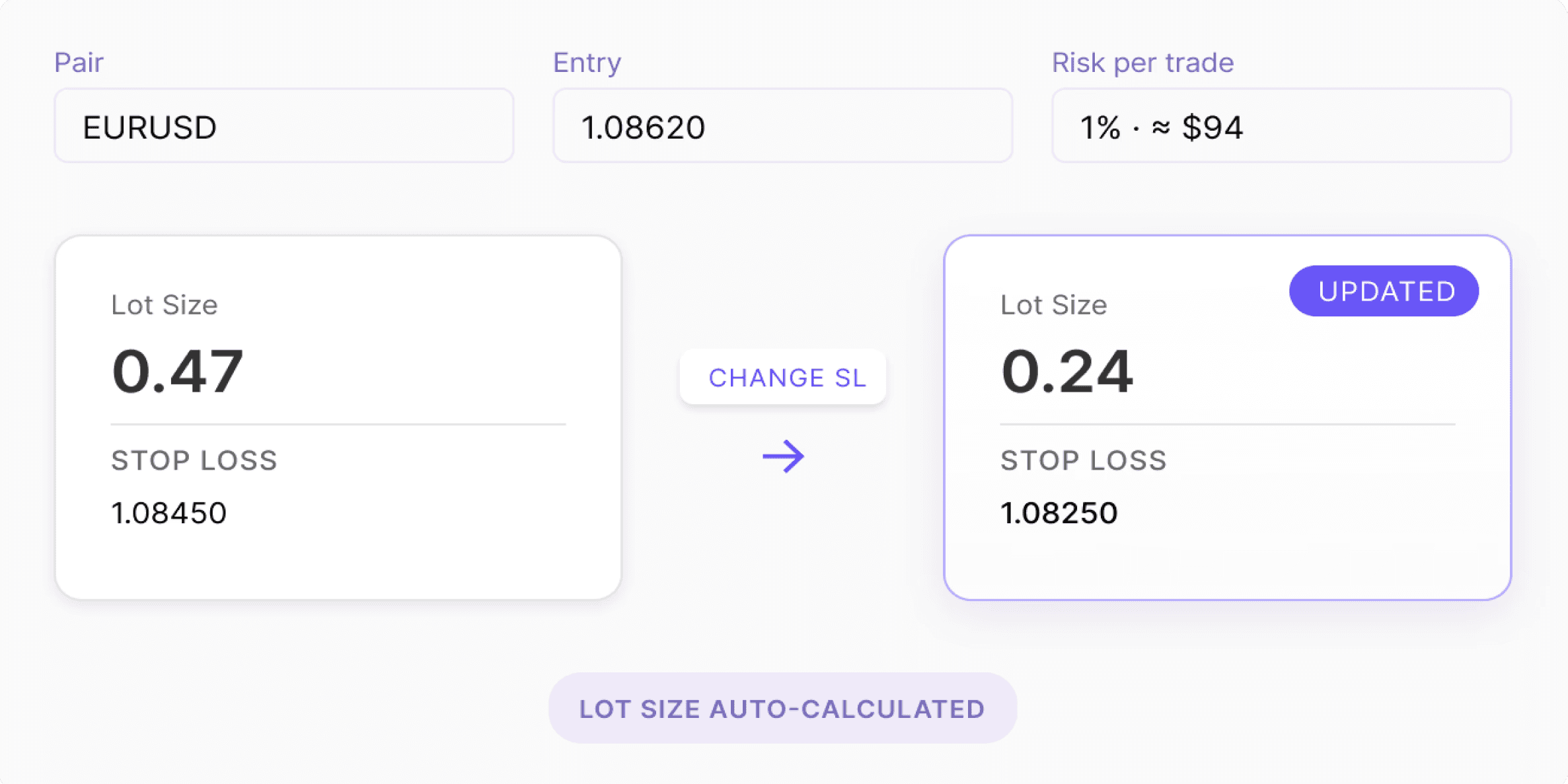 Lot size is auto-calculated instantly from your stop loss and risk settings.