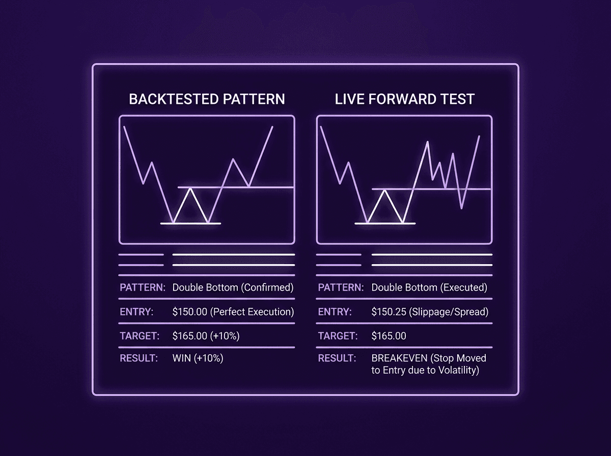 Forward testing exposes real-world problems backtesting hides: slippage, hesitation, spreads, and emotional decision-making.