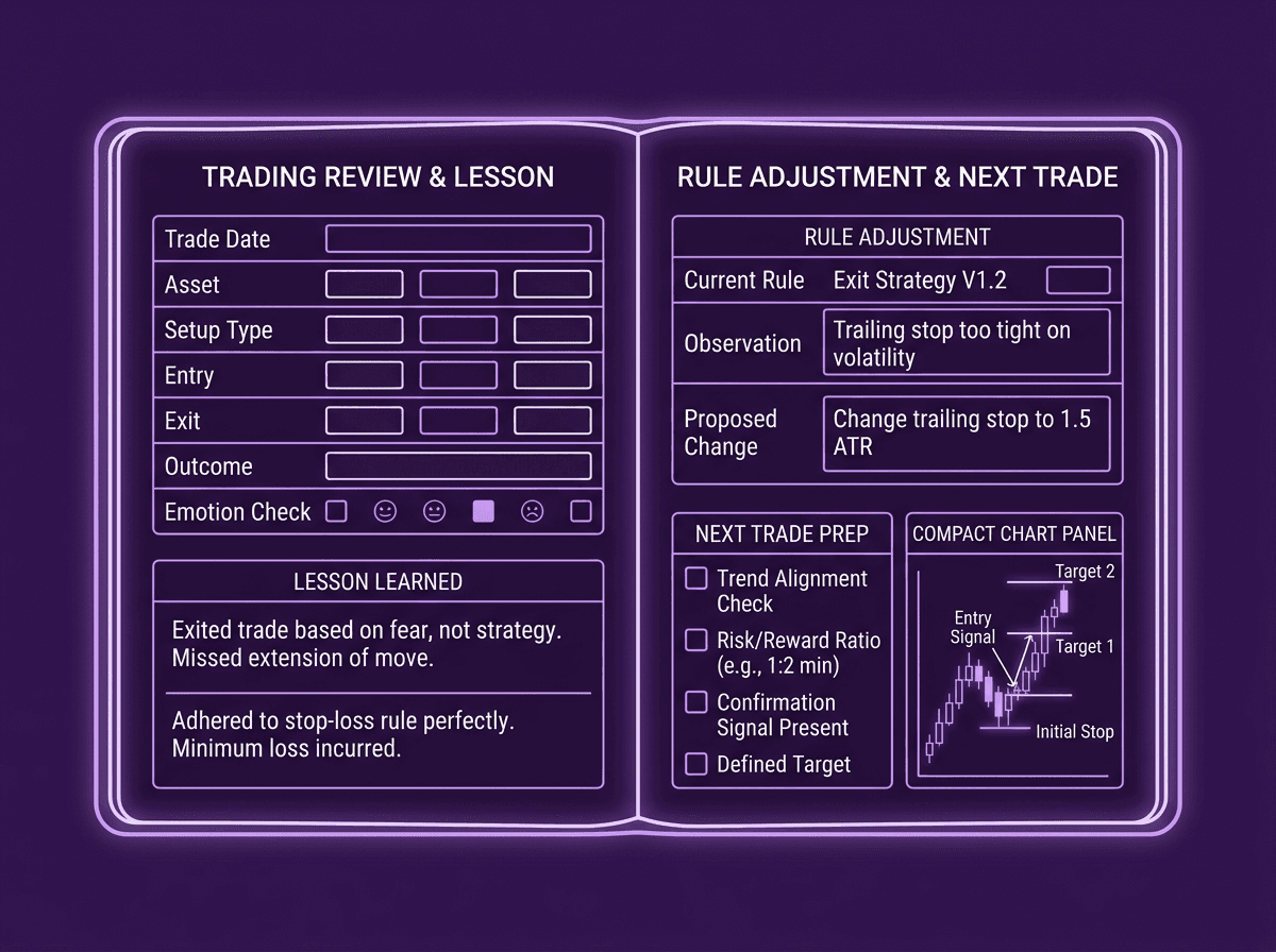 Set a weekly time to sit down and review your journal entries. Not glance at them. Actually read through each trade and ask: did I follow my plan? Where did I deviate? What patterns show up across multiple trades?